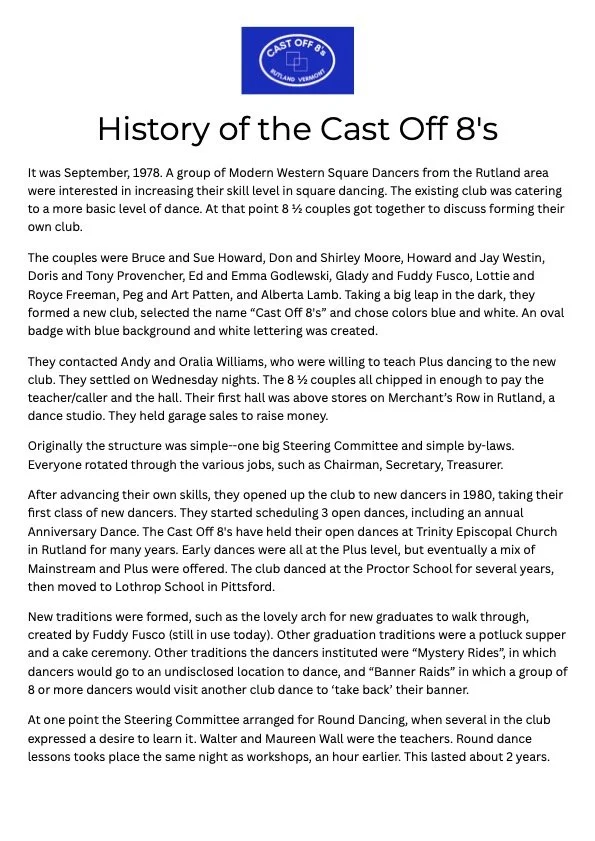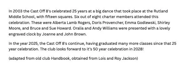 Ronnie Stevens and his wife Claire were among the original Cast Off 8’s dancers! Ronnie sends best wishes to all the club dancers. He says “keep on dancing!”